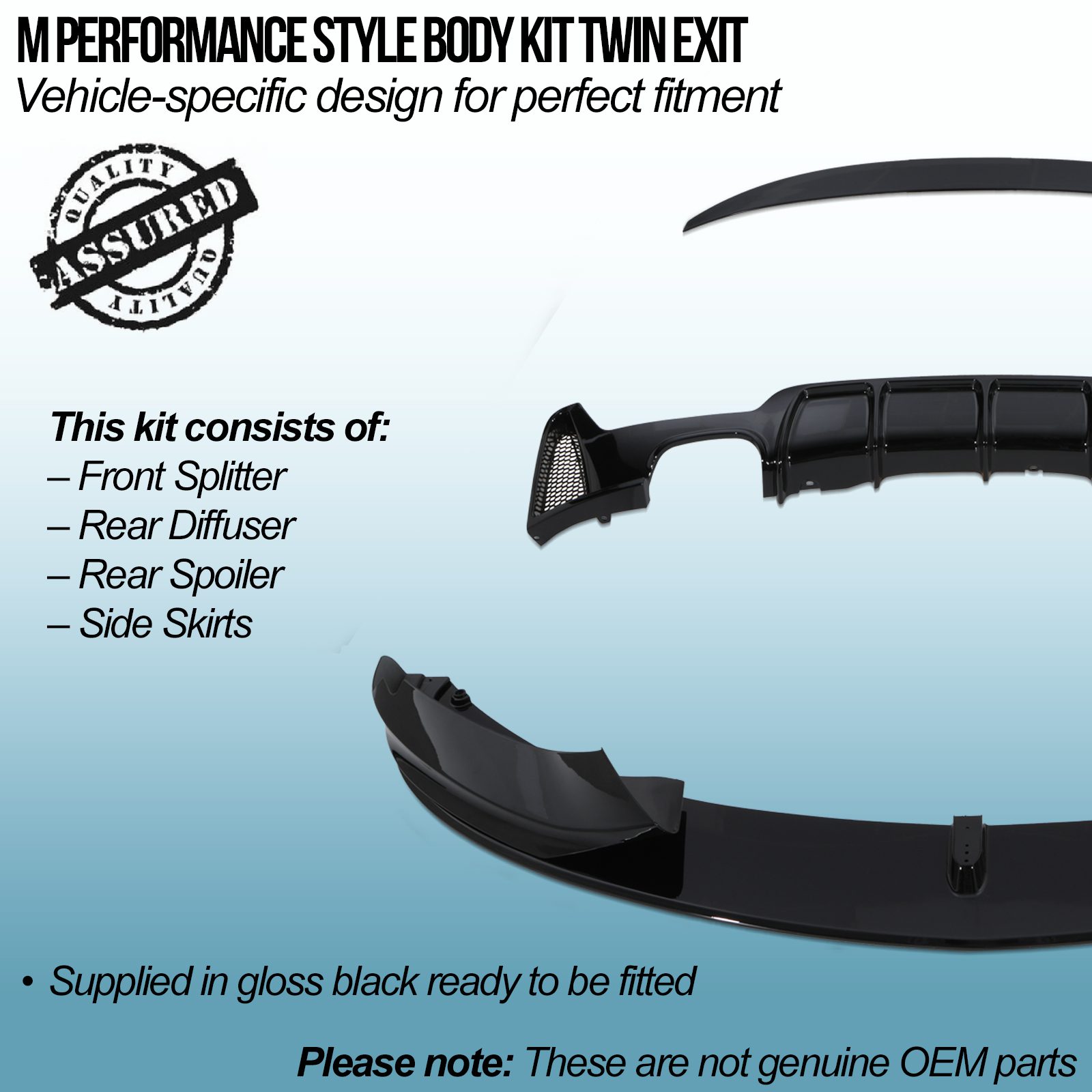 • This kit consists of: – Front Splitter – Rear Diffuser – Rear Spoiler – Side Skirts
