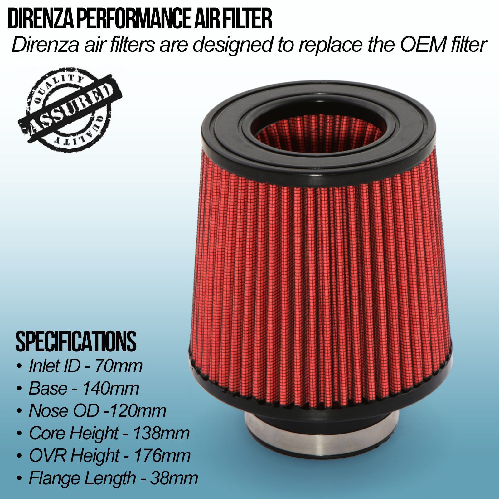 All Direnza air filters are designed to replace the OEM filter, offering more surface area compared to the standard filter and significantly enhancing air flow into your engine, boosting your car’s soundtrack and performance.