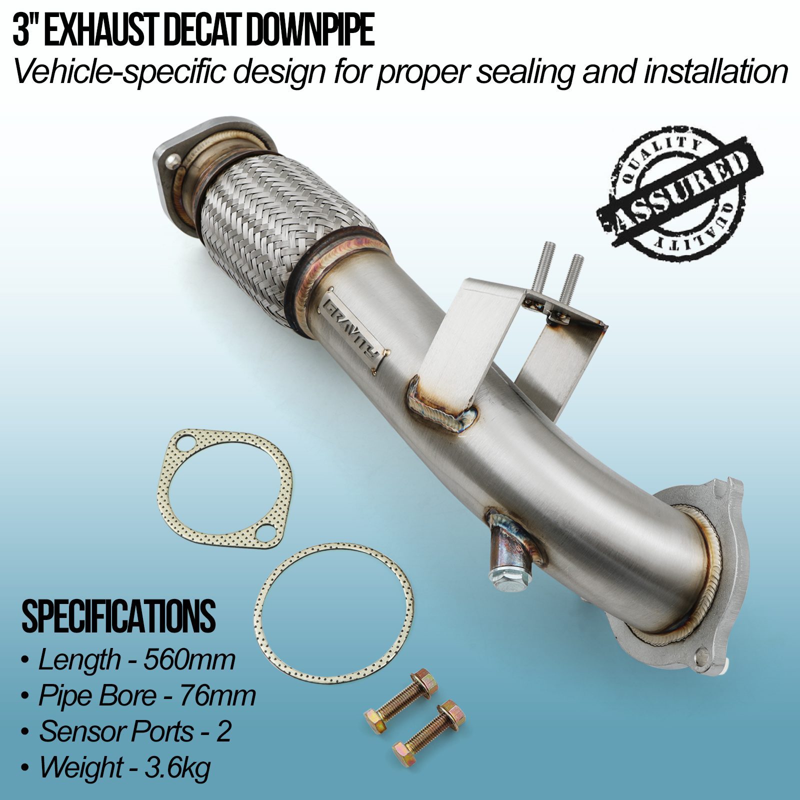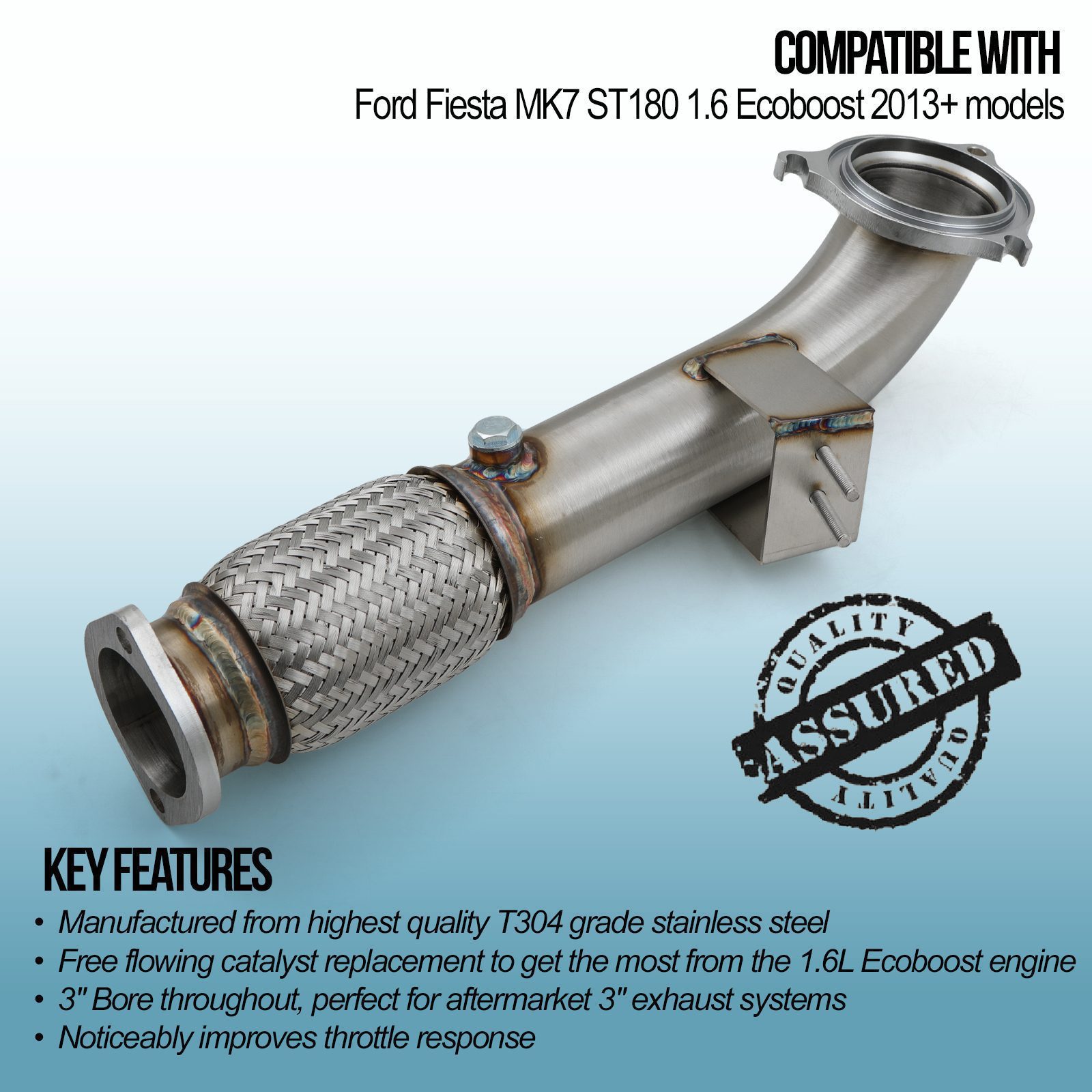 Our 3″ Exhaust Decat Downpipe compatible with Ford Fiesta MK7 ST180 1.6 Ecoboost 13+ is made from high quality Stainless Steel and features a 3″ bore to maximise gas flow through the exhaust. This 3″ Exhaust Decat Downpipe has a larger bore than the OEM part, meaning you can pair this with an aftermarket exhaust system to release even more power from the 1.6 Ecoboost engine.