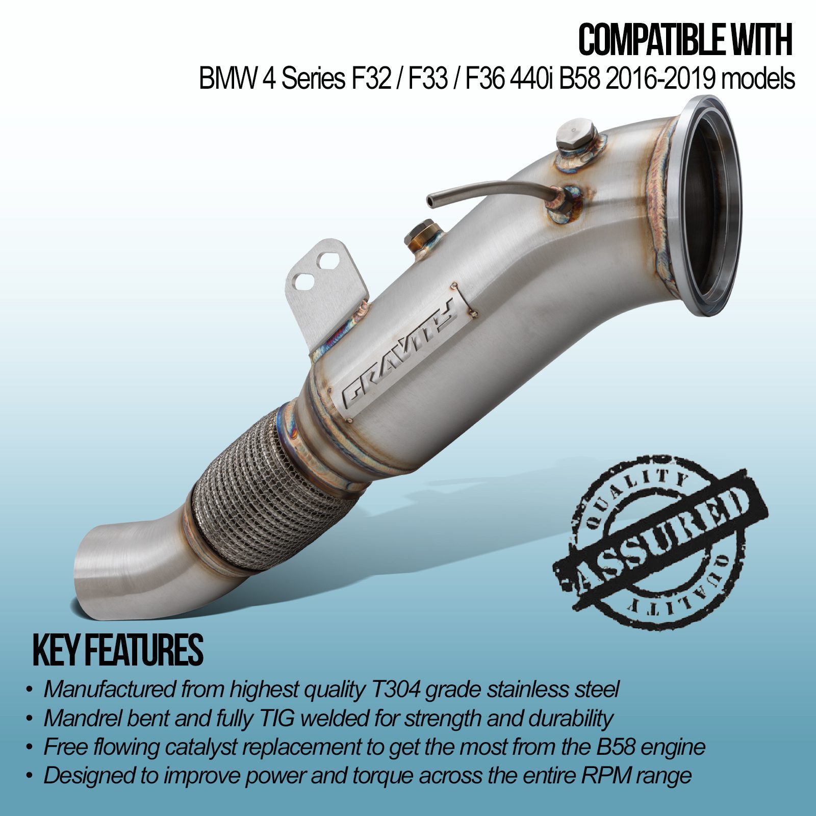4.5″ Exhaust Decat Downpipe compatible with BMW 4 Series F32 F36 440i B58 16-19, replaces the restrictive catalyst with a free flowing pipe, improving power and torque across the RPM range. Our 4.5″ Exhaust Decat Downpipe is a great cost-effective way of releasing more power from your 440i.