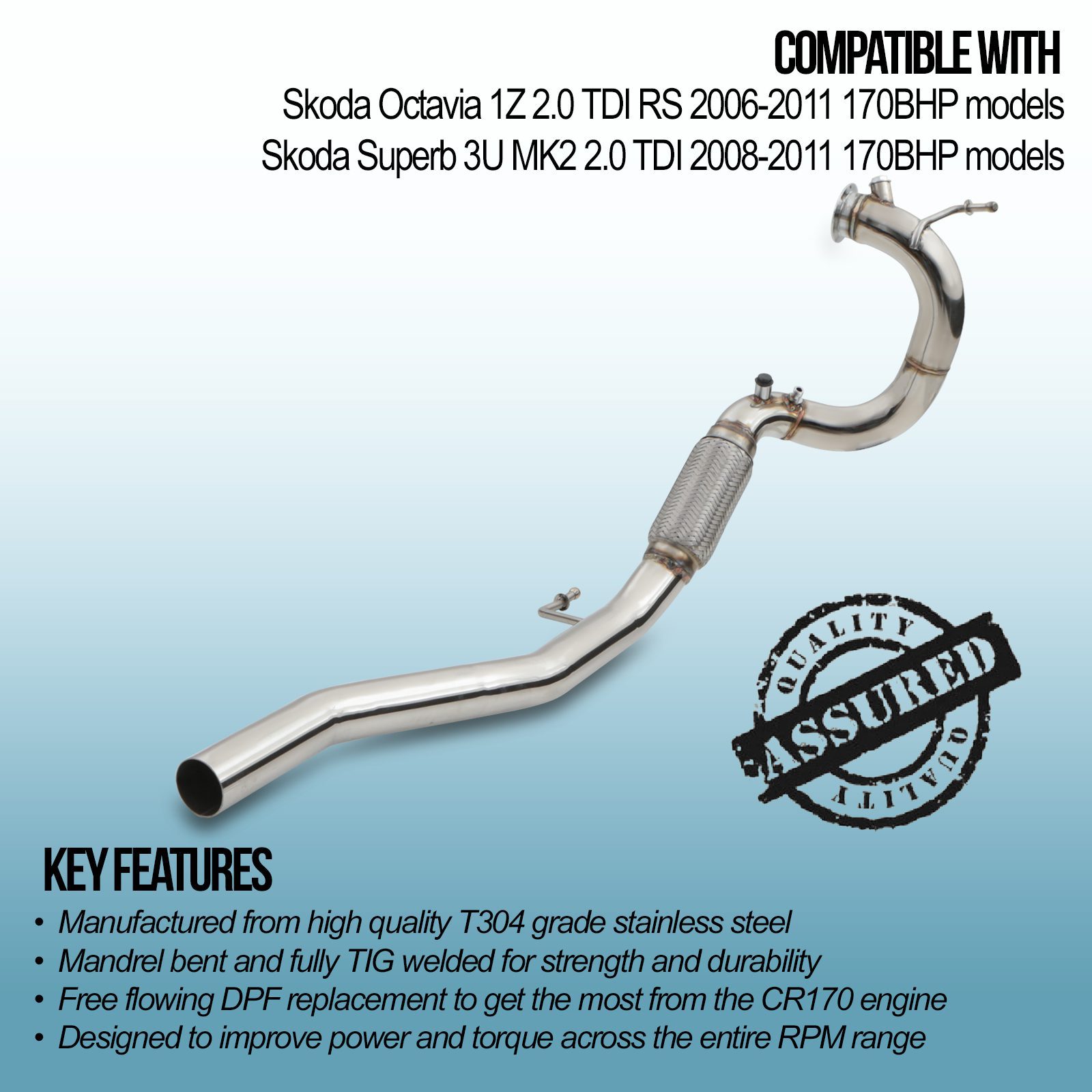 Exhaust Decat DPF Delete Pipe compatible with Skoda Octavia / Superb 2006-2011 170BHP models is an ideal replacement for your OEM cat and DPF, as it offers significant performance gains due to its less restrictive design.