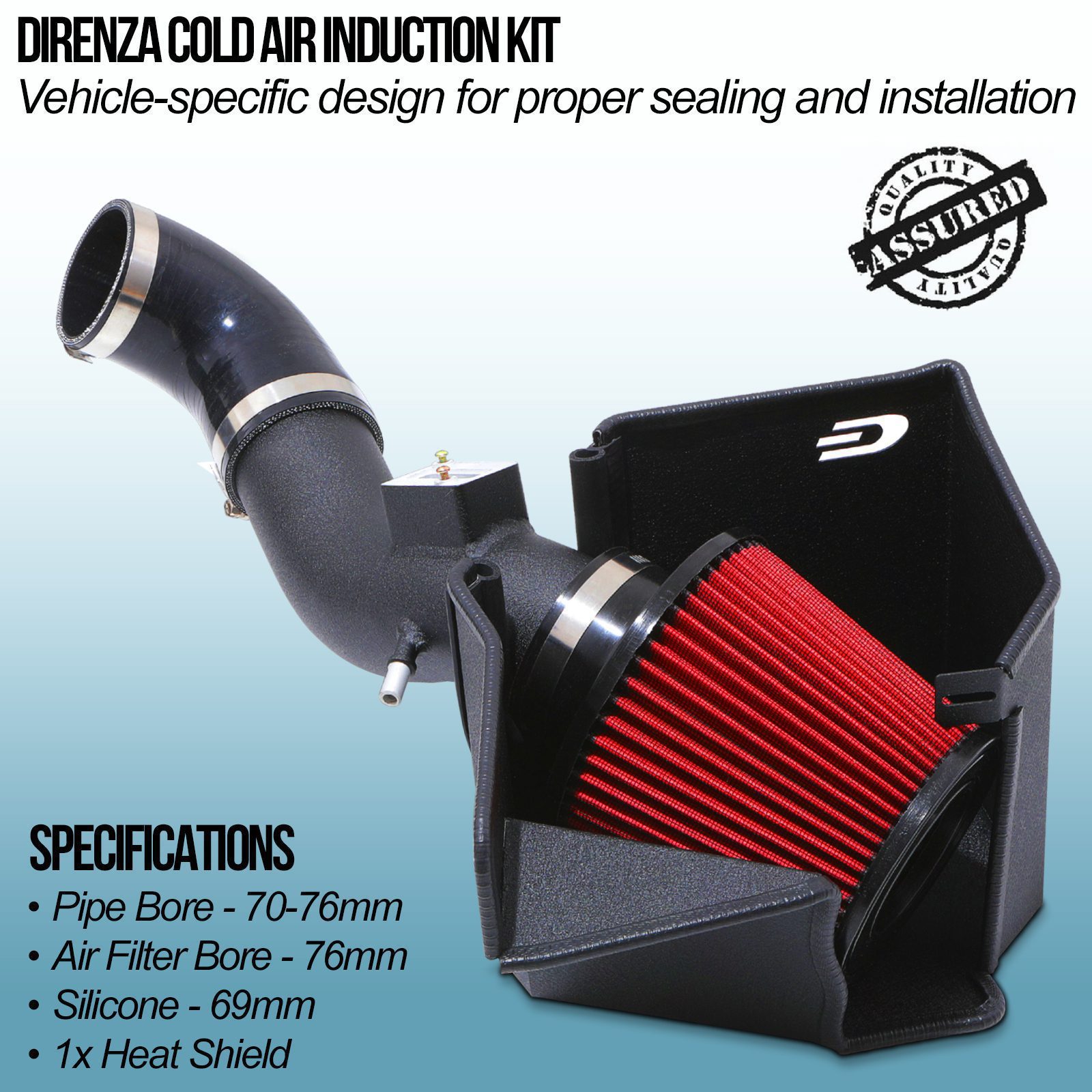 Direnza Cold Air Induction Kits include lightweight alloy pipework mandrel-bent for accurate placement on your vehicle, and coated with a premium grade, black textured finish for a sleek appearance.
