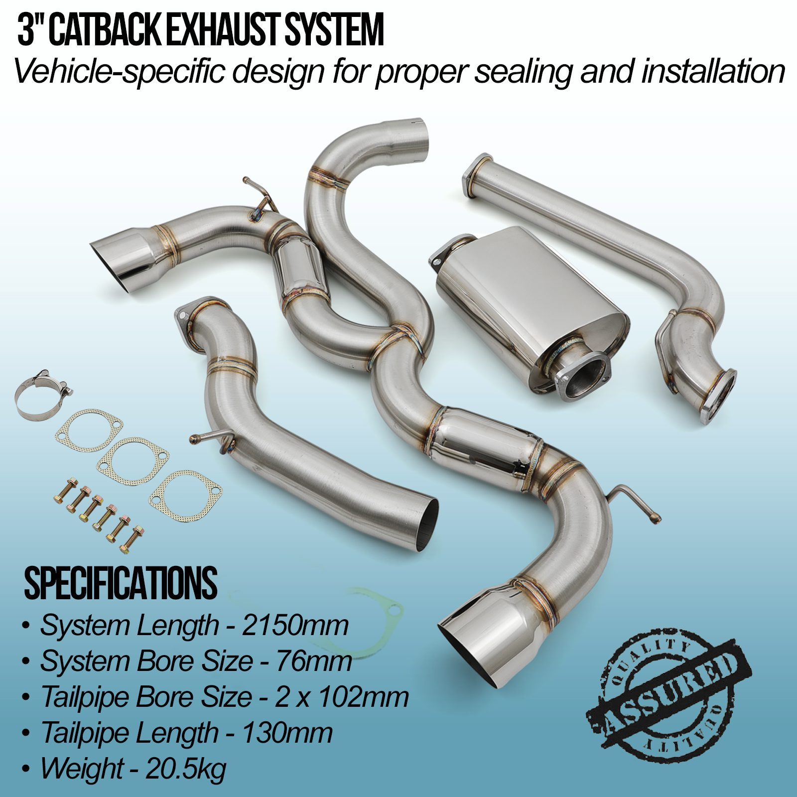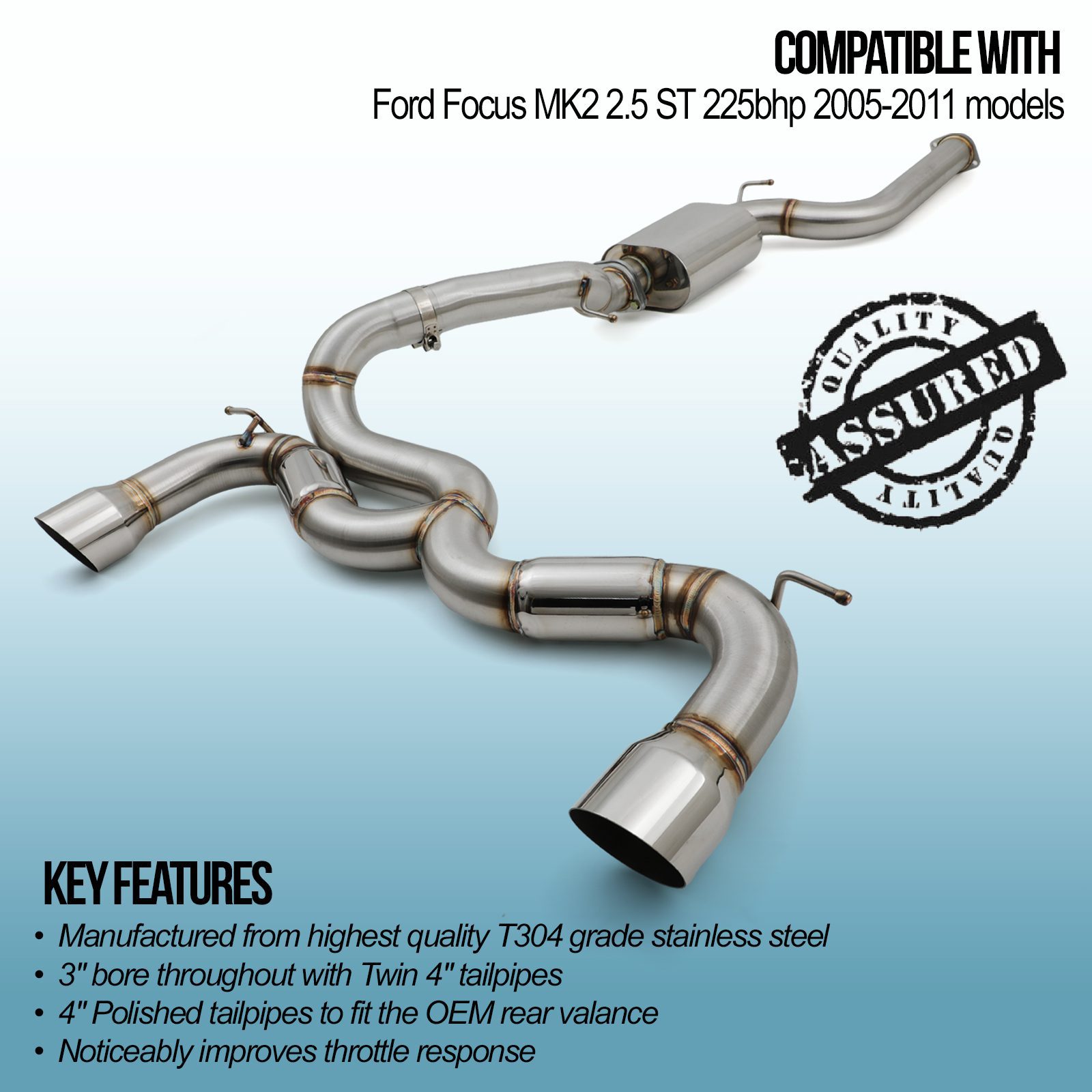 3″ Catback Exhaust System compatible with Ford Focus MK2 ST225 2.5 05-11 is a free flowing system with a 3″ bore to maximise gas flow throughout the system, producing significant power gains and improving throttle response. The 4″ polished tailpipes on our 3″ Catback Exhaust System are a great way to improve the look of your Focus whilst achieving a sporty tone from the exhaust.