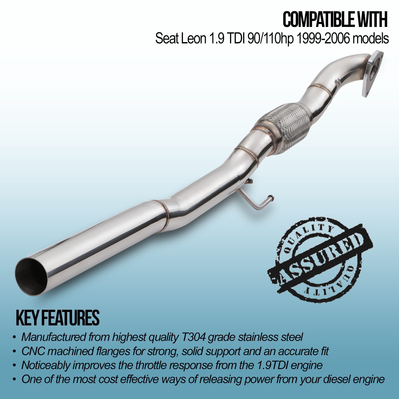 2.25″ Exhaust Decat Downpipe compatible with Seat Leon 1.9TDI 99-06, TIG welded with CNC machined flanges for durability and accurate fitment, offers a simple and cost-effective way to release power from the 1.9TDI engine. Gain improved throttle response combined with durability with our 2.25″ Exhaust Decat Downpipe.