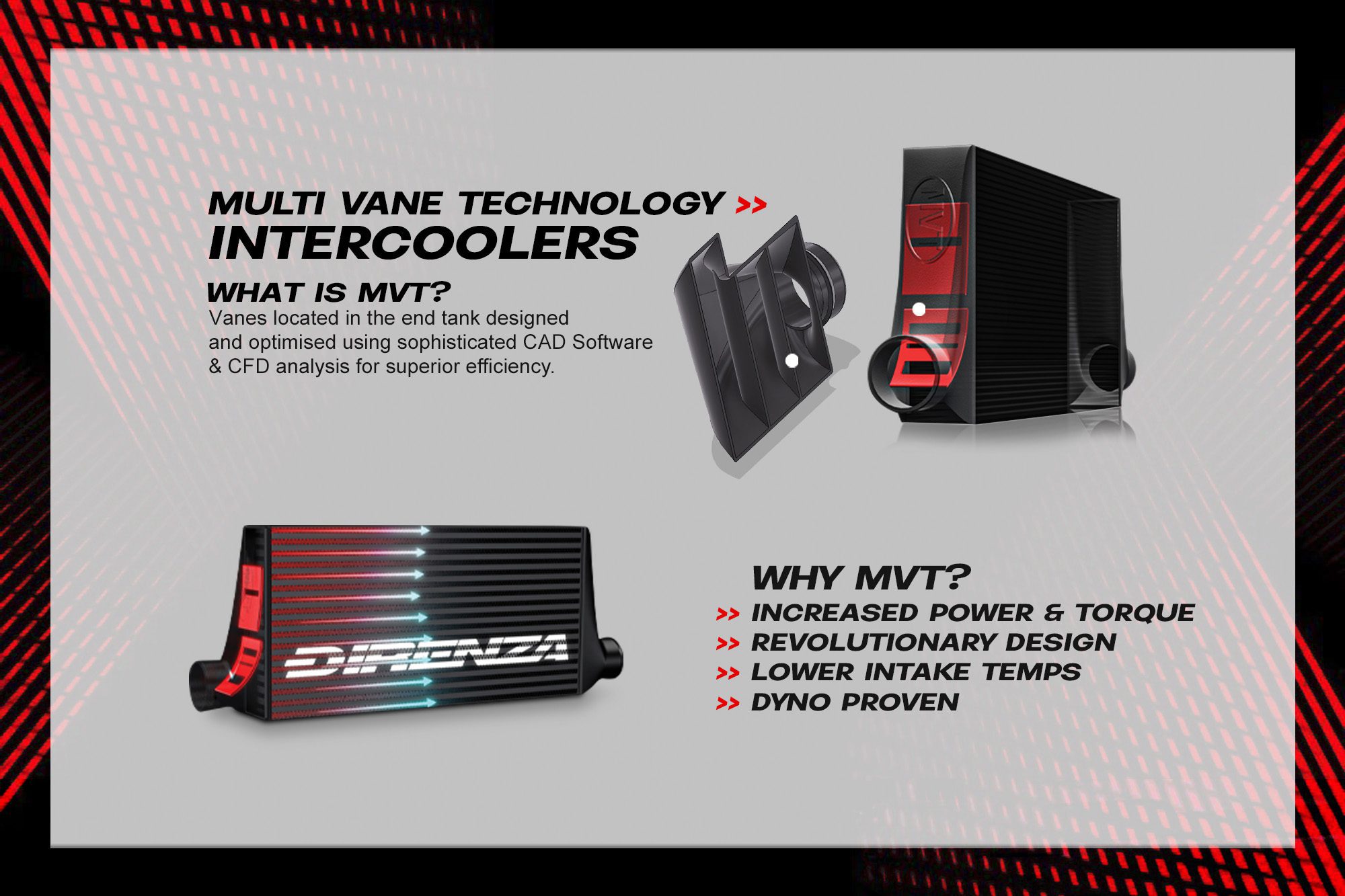 Whether you’re stage 1 tuned or pushing for more boost, cooling is critical, and Direnza’s performance intercoolers are built to handle the heat. With a focus on airflow optimisation with their patented MVT system and thermal efficiency, these intercoolers are track-tested and road-proven.